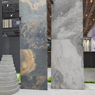 不同規格、不同厚度的熱門生態石英磚產品同臺亮相,臺面飾面、從厚到薄、由墻及地,充分展示其在不同場景和空間的應用能力。