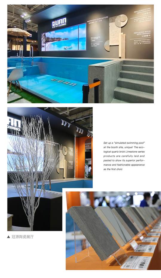 會上,冠源陶瓷以“模擬泳池”實景陳列主題館震撼登場,通過產品矩陣、動感設計帶領觀眾共啟全新境界,以小見大、以載體展整體,向全行業及全球客戶展示冠源制造“真材實料”的創新工藝和“極致品質”的非凡實力。